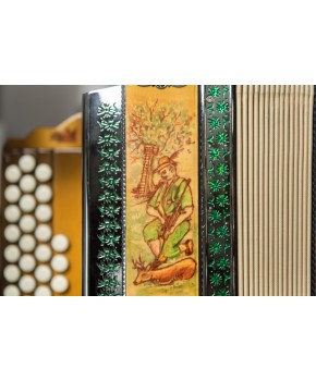 4.990,00 €Unikatna poslikava harmonike po želji kupca. Poslikava je ročno pobarvana. V harmonik so vgrajene glasilke A mano, ki bodo zadovoljile tudi najbolj zahtevnega harmonikarja. Z natančno izdelavo in kvalitetnim materialom, zagotavljajo občutno razliko v zvoku. So hitro odzivne, glasnejše in porabijo manj zraka. Triglasna uglasitev. Pri uglasitvi se prilagodimo želji stranke. Mehaniki in lahkotnemu igranju smo posvetili veliko pozornosti. Les je slovenski, skrbno izbran. Strokovno sušen in kakovostno obdelan. Diskantna mehanika je iz aluminija in dvakrat uležajena, kar pripomore k ničelni zračnosti.Mehanika je izredno lahka za igranje. Bas mehanika je večkratno uležajena, galvansko obdelana, ter zelo lahka za igranje. Meh je iz lepenke, ovčje kože in okrasnega papirja. Odlikuje ga lahko igranje in dolga življenjska doba. Pri izdelavi harmonike se še vedno ohranja tradicija ročnega dela. Izdelano v podjetju Melodija Mengeš.