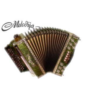 4.990,00 €Unikatna harmonika, izdelana iz okumeja in resonančne smreke. Pobarvana s posebnim kameleon efektom. V harmoniki so vgrajene glasilke A mano, ki bodo zadovoljile tudi najbolj zahtevnega harmonikarja. Z natančno izdelavo in kvalitetnim materialom, zagotavljajo občutno razliko v zvoku. So hitro odzivne, glasnejše in porabijo manj zraka. Triglasna uglasitev. Pri uglasitvi se prilagodimo želji stranke Mehaniki in lahkotnemu igranju smo posvetili veliko pozornosti. Les je slovenski, skrbno izbran. Strokovno sušen in kakovostno obdelan. Diskantna mehanika je iz aluminija in dvakrat uležajena, kar pripomore k ničelni zračnosti.Mehanika je izredno lahka za igranje. Bas mehanika je večkratno uležajena, galvansko obdelana, ter zelo lahka za igranje. Meh je iz lepenke, ovčje kože in okrasnega papirja. Odlikuje ga lahko igranje in dolga življenjska doba. Pri izdelavi harmonike se še vedno ohranja tradicija ročnega dela. Izdelano v podjetju Melodija Mengeš.