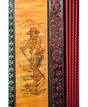 3.490,00 €Unikatna poslikava harmonike po želji kupca. Poslikava je ročno vžgana v les in pobarvana. V harmonik so vgrajene glasilke A mano, ki bodo zadovoljile tudi najbolj zahtevnega harmonikarja. Z natančno izdelavo in kvalitetnim materialom, zagotavljajo občutno razliko v zvoku. So hitro odzivne, glasnejše in porabijo manj zraka. Triglasna uglasitev. Pri uglasitvi se prilagodimo želji stranke Mehaniki in lahkotnemu igranju smo posvetili veliko pozornosti. Les je slovenski, skrbno izbran. Strokovno sušen in kakovostno obdelan. Diskantna mehanika je iz aluminija in dvakrat uležajena, kar pripomore k ničelni zračnosti.Mehanika je izredno lahka za igranje. Bas mehanika je večkratno uležajena, galvansko obdelana, ter zelo lahka za igranje. Meh je iz lepenke, ovčje kože in okrasnega papirja. Odlikuje ga lahko igranje in dolga življenjska doba. Pri izdelavi harmonike se še vedno ohranja tradicija ročnega dela. Izdelano v podjetju Melodija Mengeš.