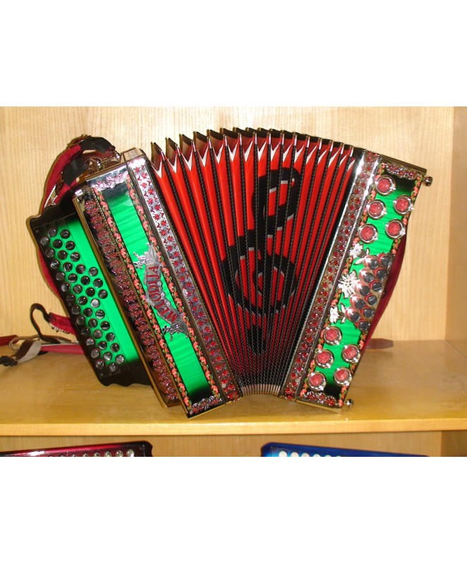Harmonika izdelana iz resonančne smreke in gorskega rebrastega javorja, z leseno robno intarzijo. V harmonik so vgrajene glasilke A mano, ki bodo zadovoljile tudi najbolj zahtevnega harmonikarja. Z natančno izdelavo in kvalitetnim materialom, zagotavljajo občutno razliko v zvoku. So hitro odzivne, glasnejše in porabijo manj zraka. Triglasna uglasitev. Pri uglasitvi se prilagodimo želji stranke Mehaniki in lahkotnemu igranju smo posvetili veliko pozornosti. Les je slovenski, skrbno izbran. Strokovno sušen in kakovostno obdelan. Diskantna mehanika je iz aluminija in dvakrat uležajena, kar pripomore k ničelni zračnosti.Mehanika je izredno lahka za igranje. Bas mehanika je večkratno uležajena, galvansko obdelana, ter zelo lahka za igranje. Meh je iz lepenke, ovčje kože in okrasnega papirja. Odlikuje ga lahko igranje in dolga življenjska doba. Triglasna uglasitev. Pri uglasitvi se prilagodimo želji stranke. Pri izdelavi harmonike se še vedno ohranja tradicija ročnega dela. Izdelano v podjetju Melodija Mengeš.