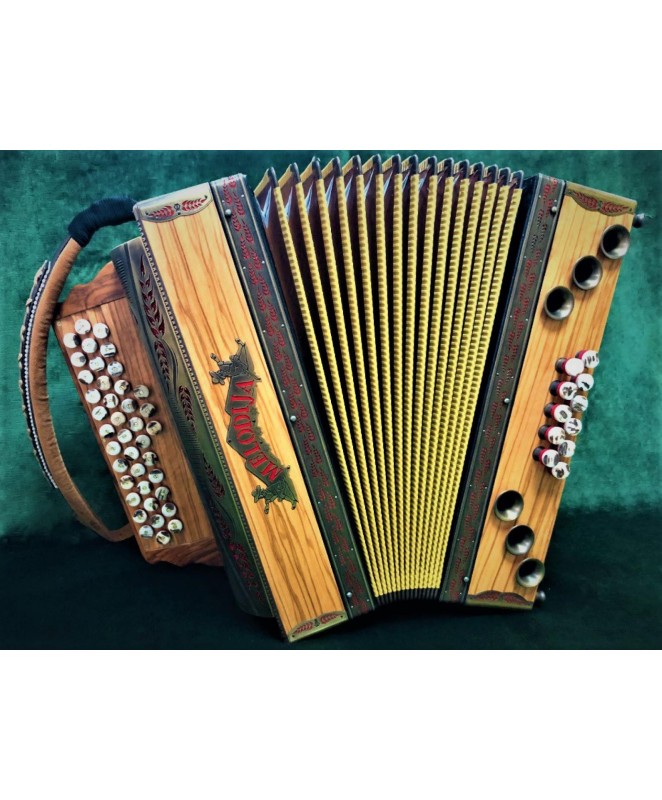 Harmonika je zasnovana na osnovi naravnih materialov, kar da harmoniki naraven pristen videz in topel žameten ton. Izdelana iz oljke, akustični elementi iz resonančne smreke. Naravno zaščiten les. Gumbi iz rogovine, poleg naravnega videza dajejo med igranjem boljši oprijem vašim prstom. Nov dizajn kovinskih elementov v zlati patini, dajejo harmoniki edinstven videz. V harmonik so vgrajene glasilke A mano, ki bodo zadovoljile tudi najbolj zahtevnega harmonikarja. Z natančno izdelavo in kvalitetnim materialom, zagotavljajo občutno razliko v zvoku. So hitro odzivne, glasnejše in porabijo manj zraka. Triglasna uglasitev. Pri uglasitvi se prilagodimo želji stranke. Mehaniki in lahkotnemu igranju smo posvetili veliko pozornosti. Les je slovenski, skrbno izbran. Strokovno sušen in kakovostno obdelan. Diskantna mehanika je iz aluminija in dvakrat uležajena, kar pripomore k ničelni zračnosti.Mehanika je izredno lahka za igranje. Bas mehanika je večkratno uležajena, galvansko obdelana, ter zelo lahka za igranje. Meh je iz lepenke, ovčje kože in okrasnega papirja. Odlikuje ga lahko igranje in dolga življenjska doba. Glasilke na diskantu so super dural, na basu A mano. Odlikuje jih hitra odzivnost in manjša poraba zraka. Triglasna uglasitev. Pri uglasitvi se prilagodimo želji stranke. Pri izdelavi harmonike se še vedno ohranja tradicija ročnega dela. Izdelano v podjetju Melodija Mengeš.