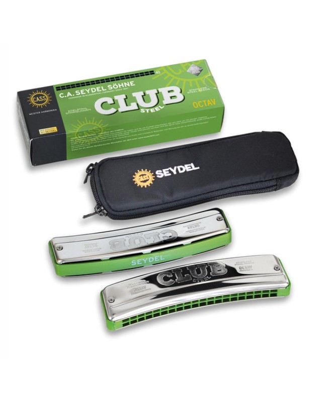 rounded coverplates made of stainless steel curved double row comb made of durable ABS-plastic, very "lip-friendly" reedplates made of German Silver (srewed) reeds and rivets as well as all used screws made of stainless steel measures: 14,5 x 4,4 x 2,3 cm weight: 115g The CLUB STEEL is the ideal companion for your every day use or for any hiking tour. Long durability and high tuning stability guaranteed. The CLUB STEEL comes with a practical and well protecting beltbag (available in the keys of Bb, C, D, and HG).