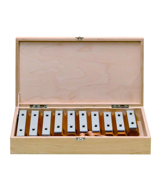 Komplet 10 zvončkov, bukev les, zvočne plošče iz aluminija, c2 – c3, fis2 + bb2, 10 lesenih udarjalk v leseni škatli