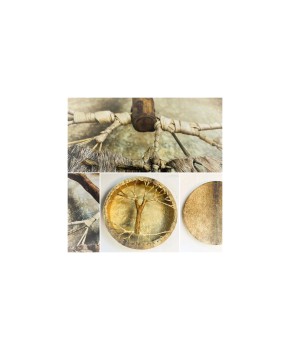 Šamanski boben iz mahagonijevega lesa s kozjo kožo in dlako ter ročajem v obliki drevesa,