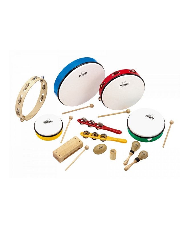 Vključuje: 1x ABS Tambourine 25cm (NINO24R)/1x ABS Ročni boben 30cm (NINO6SB)/1x ABS Ročni boben 20cm (NINO45GG)/1x ABS Ročni boben 15cm (NINO4Y)/1x Skin Maracas par, majhen (NINO10) /1x Skin Egg Shaker (NINO11)/1x leseni Block, velik (NINO22)/1x Jingle Stick, rumen (NINO13Y)/1x Jingle Stick, rdeč (NINO13R)/1x lesen Tambourine, 25cm (NINO14)/1x Wood Shaker, majhen (NINO1)