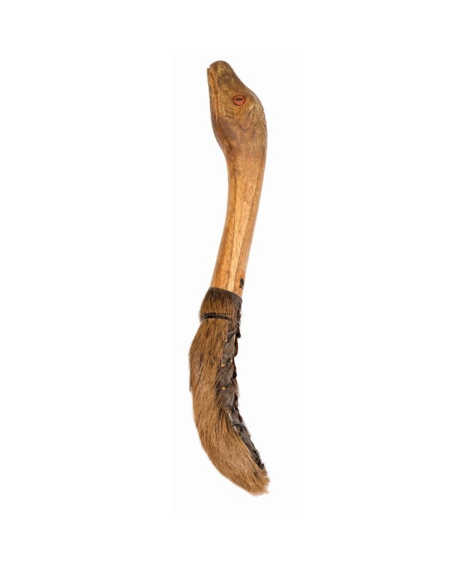 Sestavljen je iz ročno izdelanega lesenega ročaja dolžine 30-35 cm in značilne glave,ki je na zadnjem koncu okrašena s čudovito ročno izrezljano kačjo glavo. Je ročno vozlana iz podloženega kozjega usnja. Kladivo obljublja popolnoma pristen užitek bobnanja.