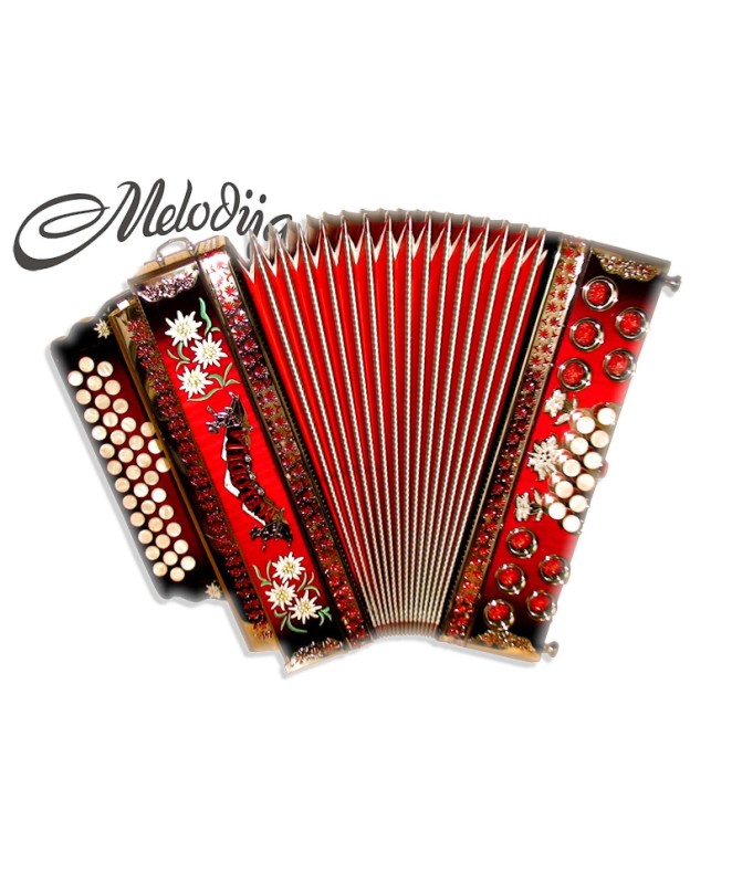 Unikatna poslikava harmonike po želji kupca. Poslikava je ročno pobarvana. Mehaniki in lahkotnemu igranju smo posvetili veliko pozornosti. Les je slovenski, skrbno izbran. Strokovno sušen in kakovostno obdelan. Diskantna mehanika je iz aluminija in dvakrat uležajena, kar pripomore k ničelni zračnosti.Mehanika je izredno lahka za igranje. Bas mehanika je večkratno uležajena, galvansko obdelana, ter zelo lahka za igranje. Meh je iz lepenke, ovčje kože in okrasnega papirja. Odlikuje ga lahko igranje in dolga življenjska doba. Glasilke na diskantu so super dural, na basu A mano.Odlikuje jih hitra odzivnost in manjša poraba zraka. Triglasna uglasitev. Pri uglasitvi se prilagodimo želji stranke. Pri izdelavi harmonike se še vedno ohranja tradicija ročnega dela. Izdelano v podjetju Melodija Mengeš.