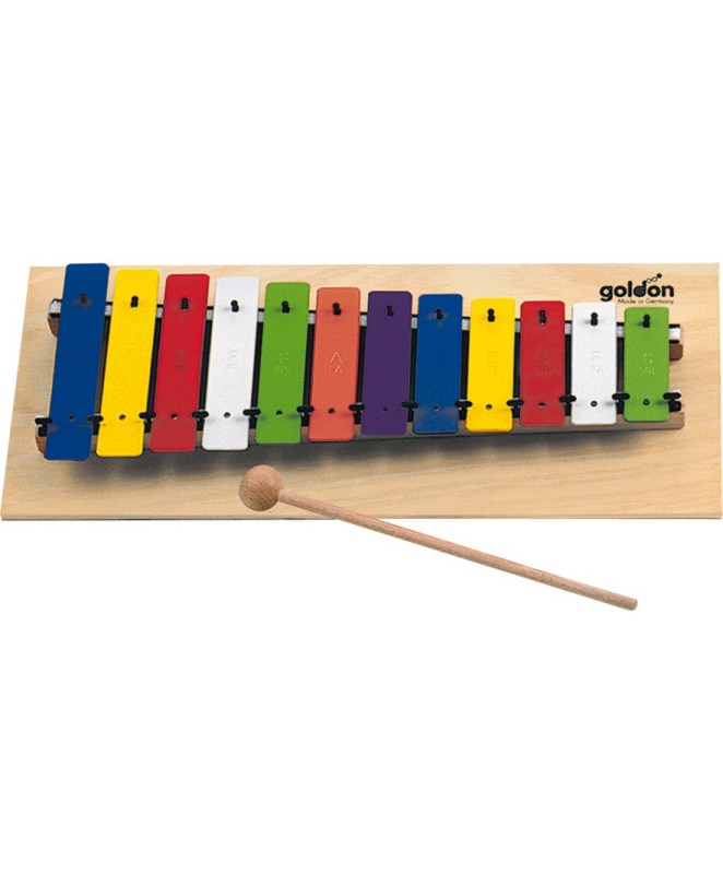12 barvnih zvočnih plošč, diatonično, c3 – g4, osnovna plošča iz vezanega lesa, okvir iz smreke, z 1 leseno udarjalko, pesmarica, v barvni škatli za prodajo.
