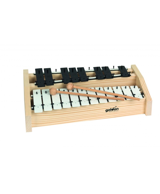20 zvočnih plošč iz jekla, c3 – a4, 20 x 2 mm, fino uglašene, belo/črno barvane, resonančna škatla iz smreke. 2 leseni udarjalki.
