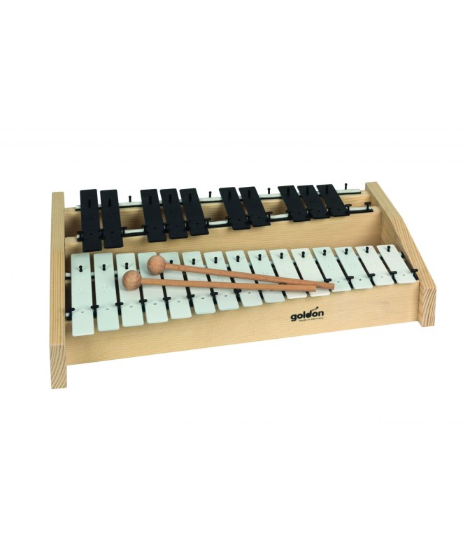 22 zvočnih plošč iz jekla, c2 – c4, belo/črno barvano, resonančna škatla iz smreke. 2 leseni udarjalki.